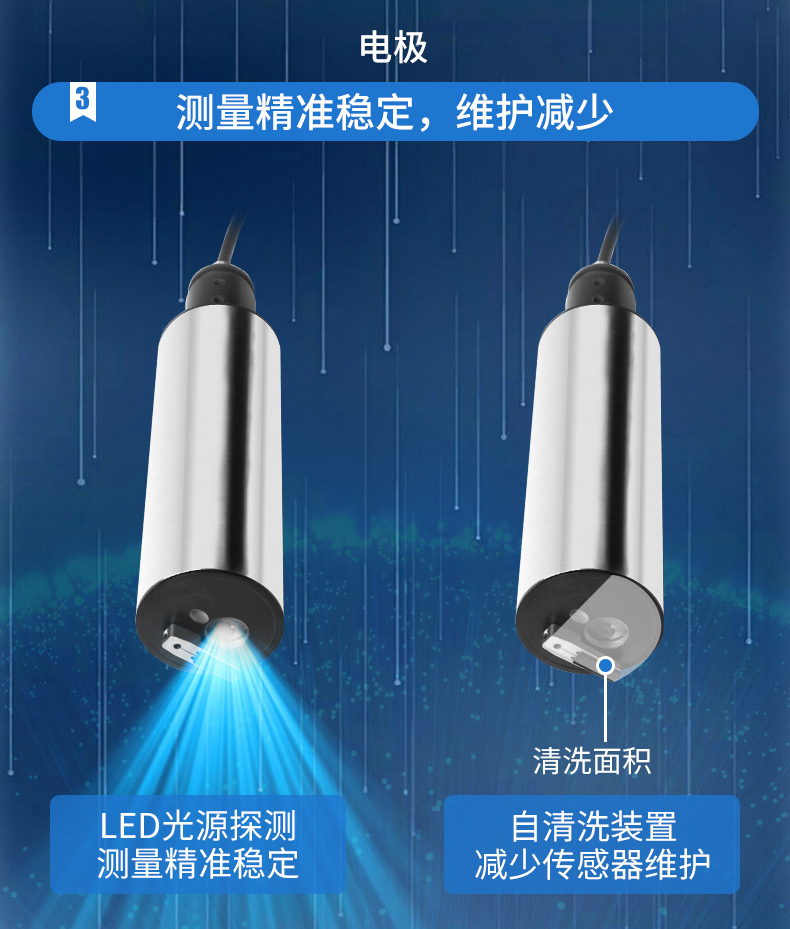 產品描述:懸浮物(污泥濃度)傳感器基于紅外散射光技術,即光源發出的紅外光在傳輸過程中經過被測樣品時會發生散射,其散射光強度和懸浮物濃度成正比關系。